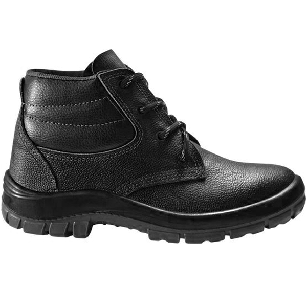 Botina de Segurança com solado antiderrapante, sem bico e com elástico, confeccionada em couro com curtimento atravessado, fechamento em cadarço, forração em tecido não tecido transpirável, palmilha de montagem em E.V.A fixada/costurada junto ao cabedal , solado em PU densidade bicolor com sistema de absorção de impacto, injetado diretamente ao cabedal.