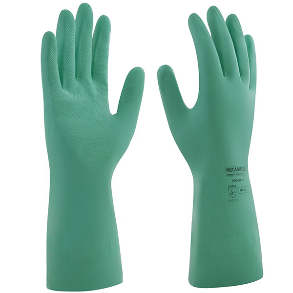 Luva com forro de algodão flocado, revestimento em látex nitrílico, punho liso e palma antiderrapante.