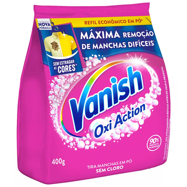 O Vanish Oxy Action elimina as manchas, os odores e realça as corres. Com incrível remoção de manchas na primeira lavagem.
