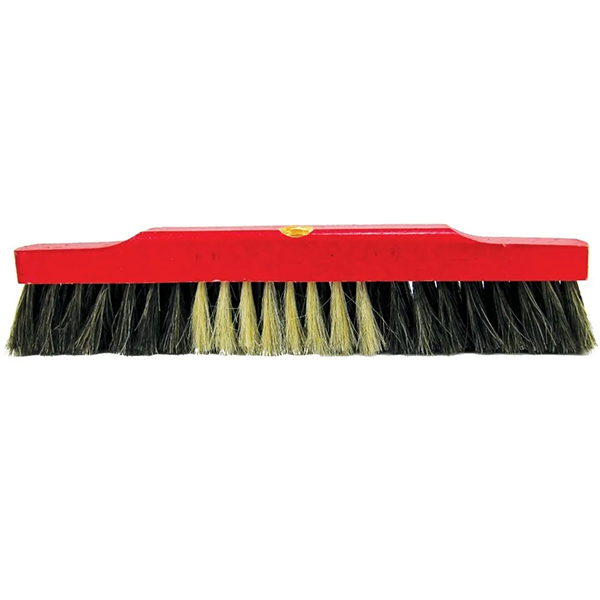 Vassoura produzida com cerdas de crina de cavalo e base de madeira.